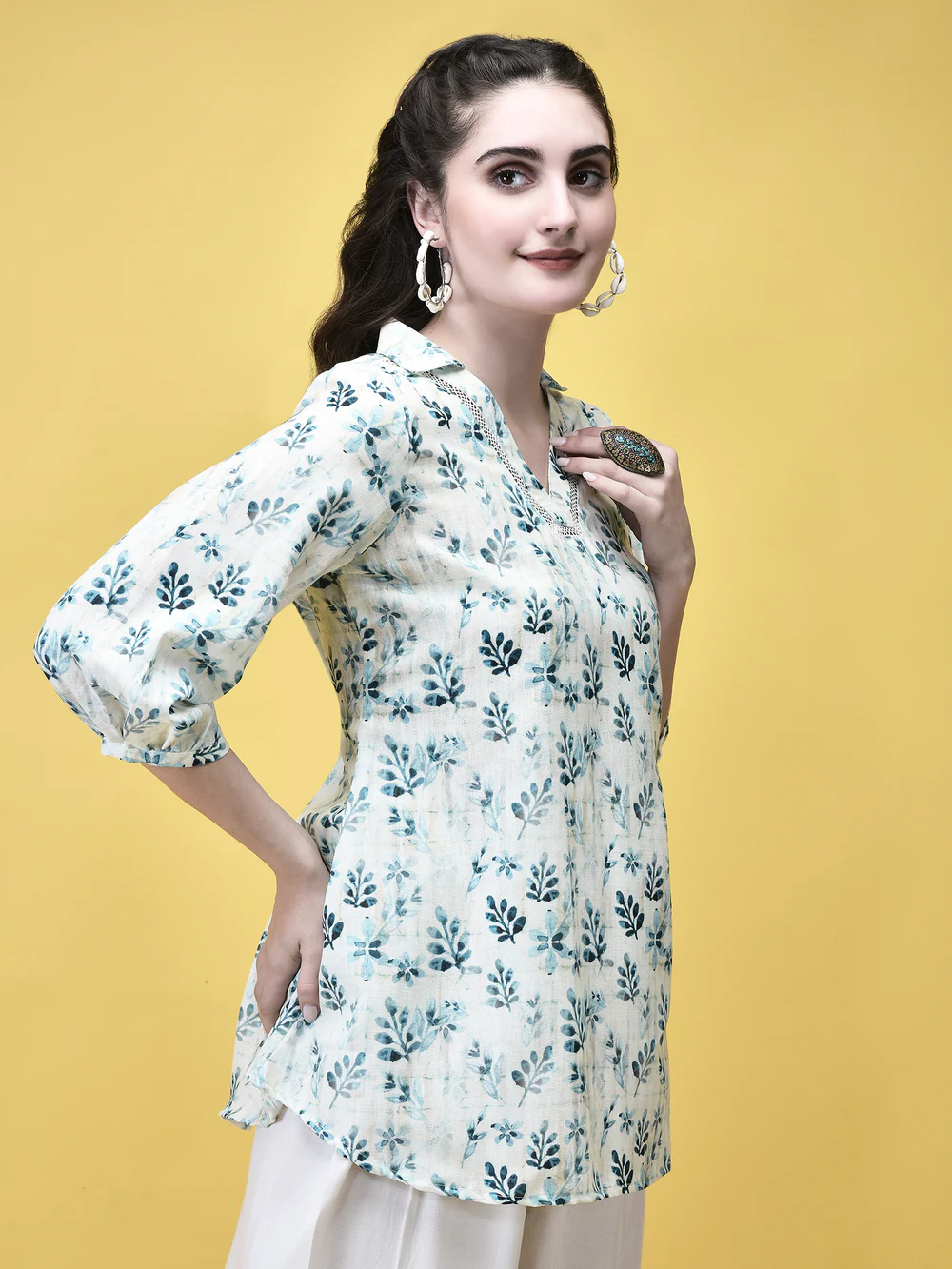 It sounds like you’re referring to a women’s tunic made from linen, featuring an off-white base with a teal textured print. This style is often associated with a breezy, comfortable fit—great for casual or semi-formal occasions. Here are a few details that might typically describe such a tunic: